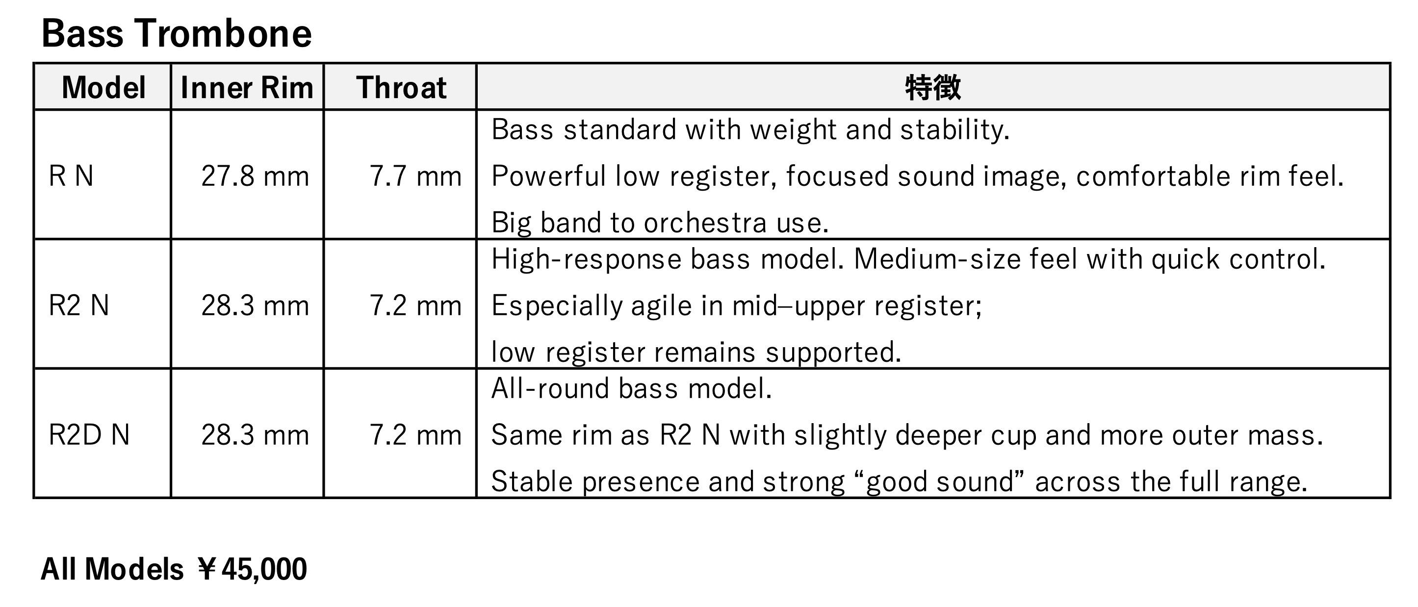 • Shares some characteristics with medium-large mouthpieces such as the Ferguson L, with a really nice comfortable rim and sweet bass trombone sound